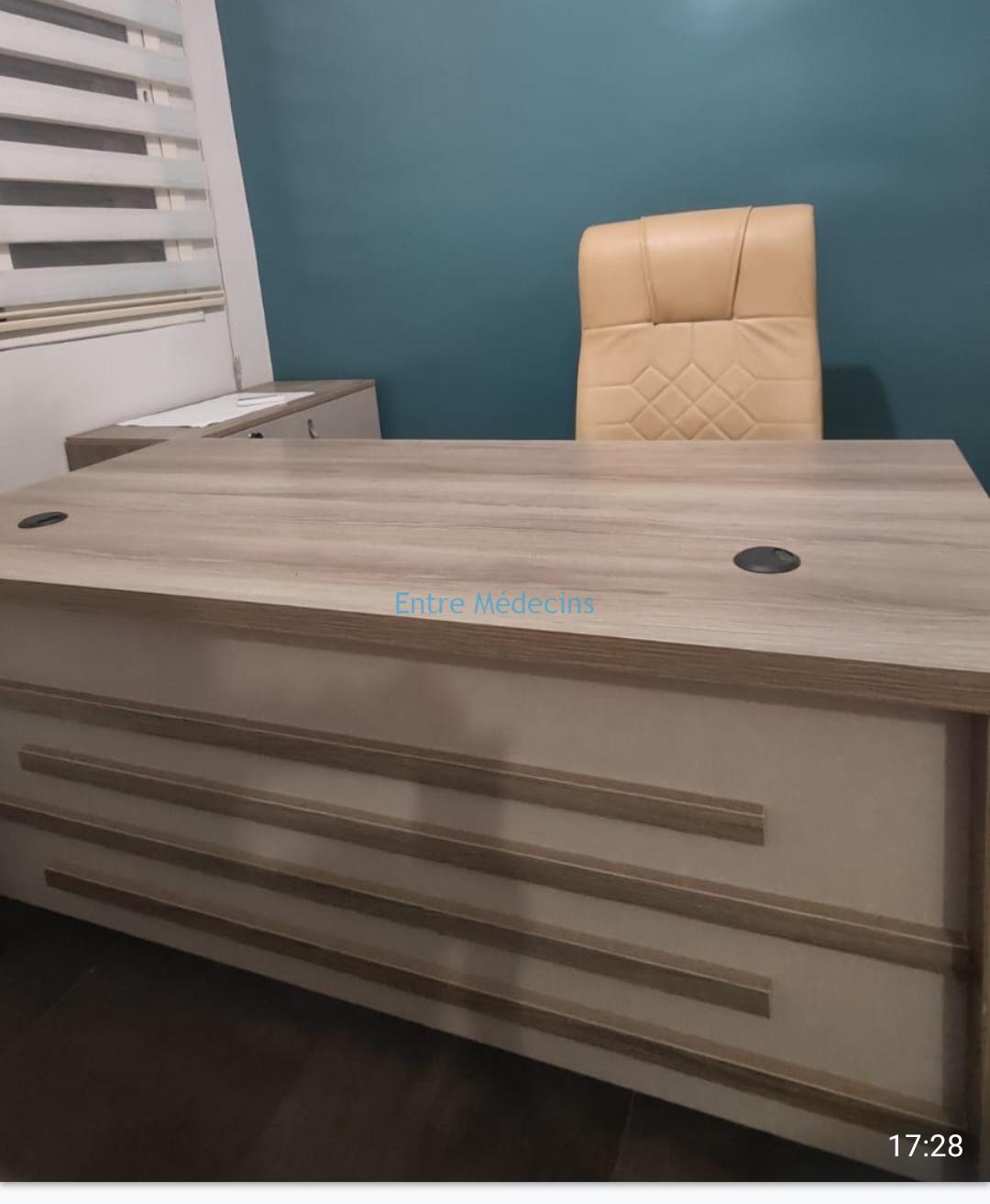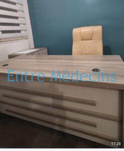 Bureau complet (rangement, caisson, table basse et chaise fauteuil)+ table de réunion et quatre chaises+comptoir accueil (1m60).