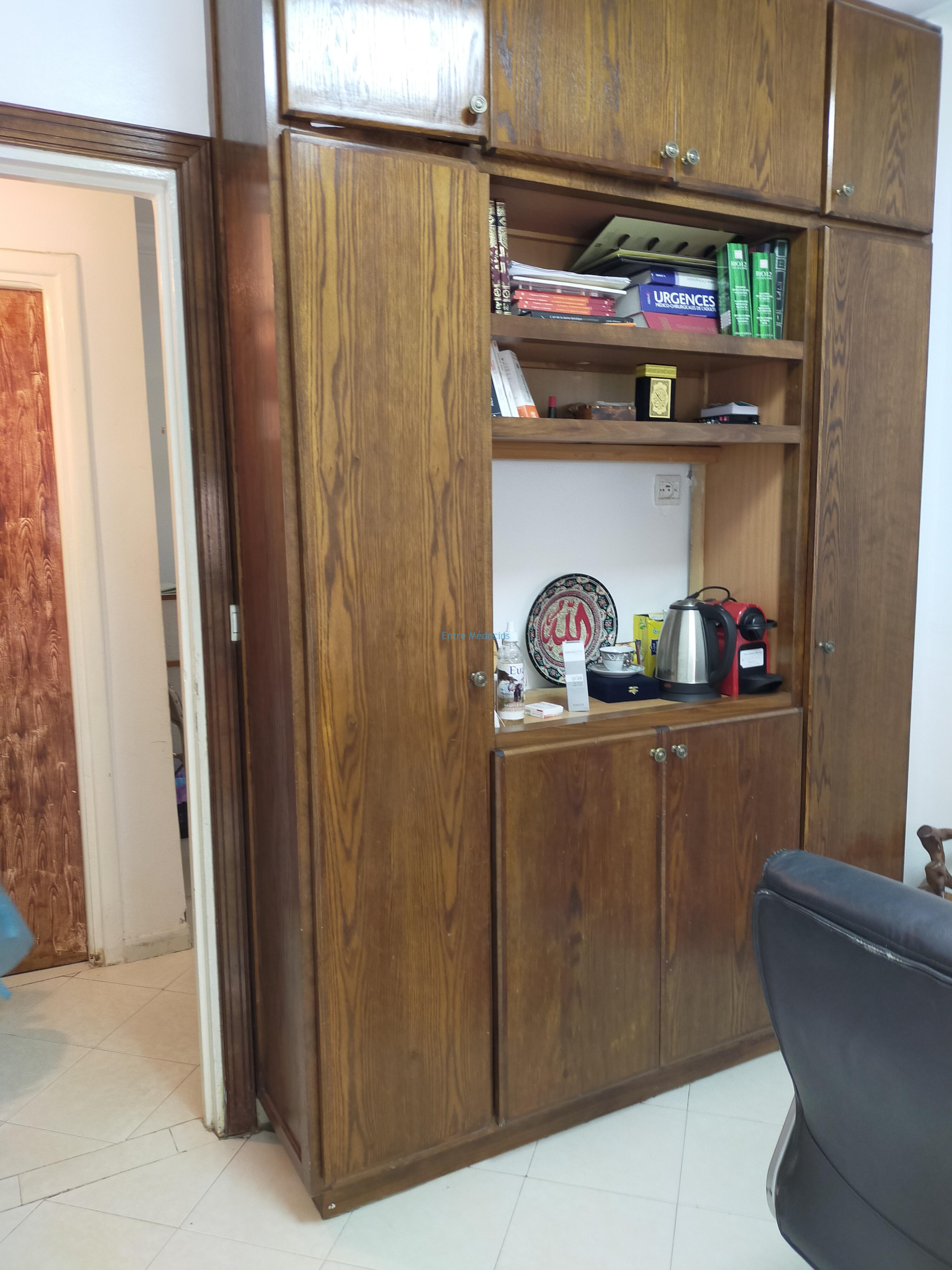 1bureau bois massif, chaise président, 2chaises invités,10 chaises pour patients, Un canapé, 3 tables d’examen, 4 armoires, Un comptoir pour assistante